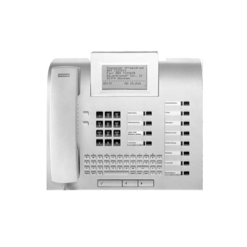 The Siemens Optiset E Memory Telephone is the most advanced telephone in the Optiset range. In addition to dialogue-oriented operation and 12 programmable function buttons, it has many connection options with 2 adapter positions. The special feature of the Siemens Optiset E Memory is its electronic notebook which will take up to 300 notes via the alphanumeric (QWERTZ) keypad, for example names, addresses and phone numbers. The data strings are displayed on a large eight-line display.