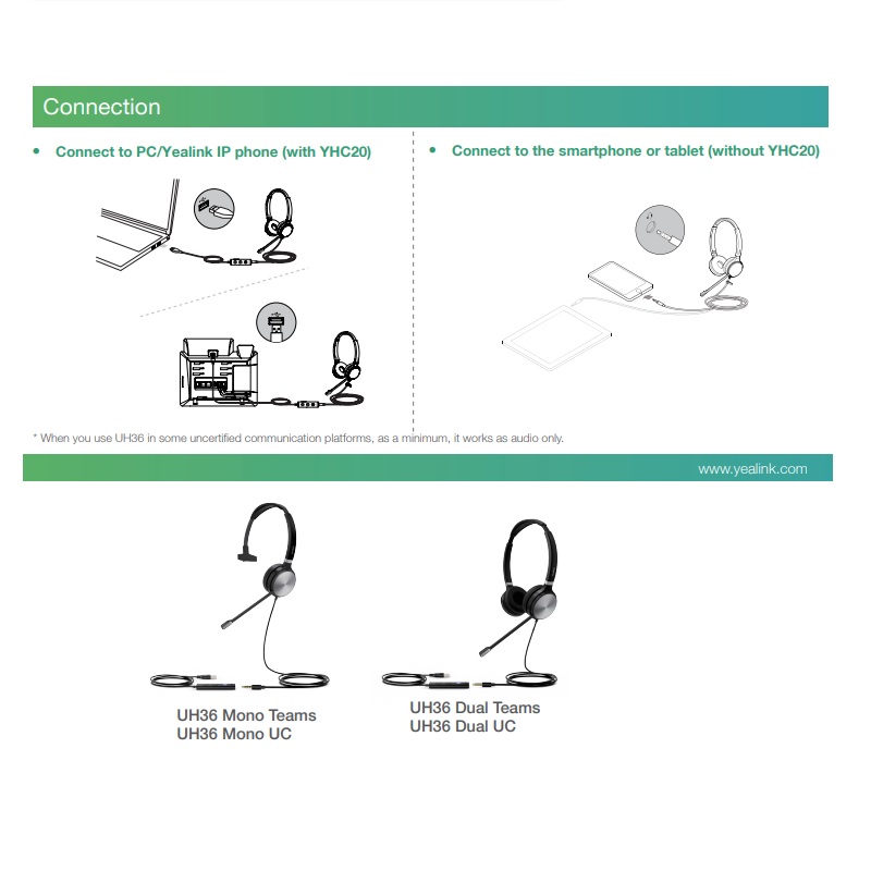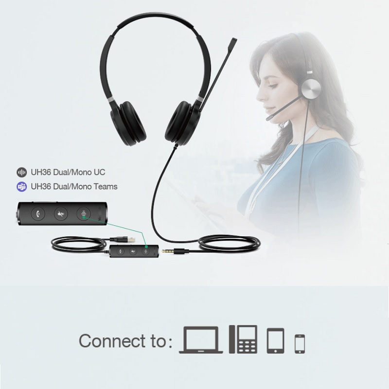 Simple and flexible connectivity - Designed for Unified Communication, UH36 comes with USB and 3.5mm jack connectivity options, free to plug into various devices: IP phone, PC, tablet, smart phone and Yealink IP DECT handsets.